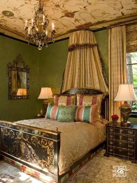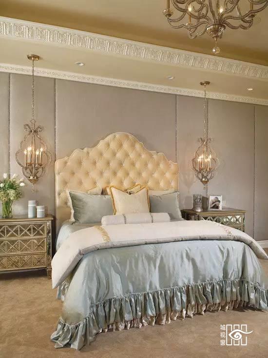 软包的床头板高贵典雅,棉花糖般柔软的床上用品给睡眠甜美的梦境。古铜的烛台吊灯神秘古朴的韵味扑面而来,淡金色的背景墙面大气而高贵。