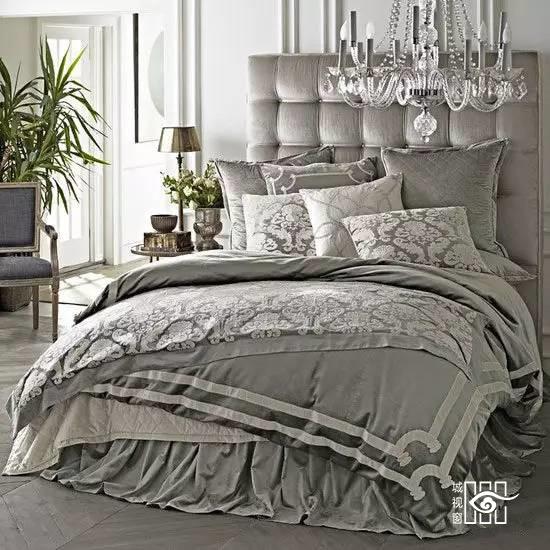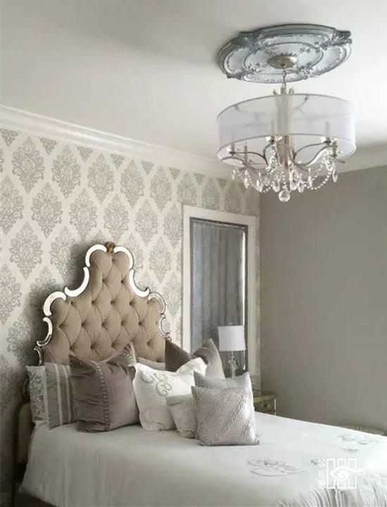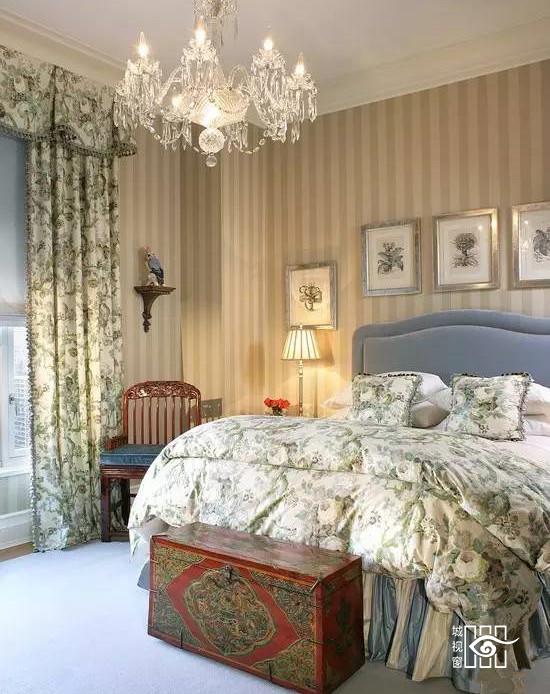 田园风情的花纹窗帘和床罩在欧式轻奢的风情里带来一丝清新自然,床罩的褶皱和吊灯的水晶梦幻让卧室里散发唯美的高贵情调。
