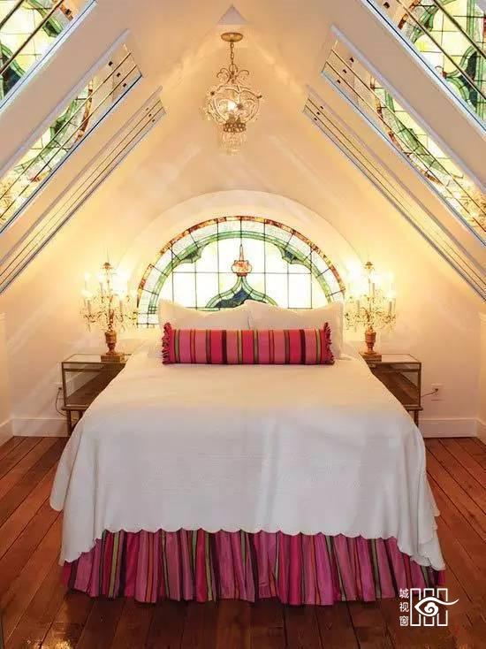 尽管这是款阁楼卧室,但也没有影响它的美观,相反在它独特形状的墙壁上开出几扇不同的窗户,颜色各异的装饰反而让室内别有梦幻的光线感。