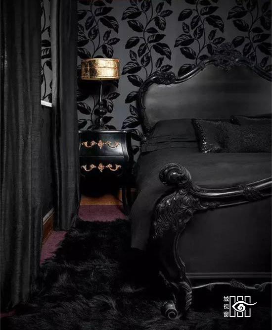 个性女孩也可以选择这样一款纯黑色系的神秘孤傲卧室。黑色深沉而低调,欧式的线条设计,雕刻设计华美异常。