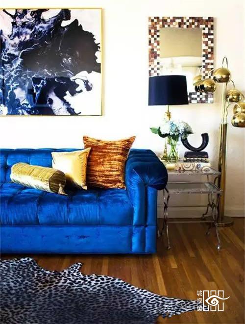 引人注目的伊夫·克莱因蓝(Yves Klein blue)沙发经典又大胆。和金色和动物纹配饰搭配腔调十足,充满魅惑。