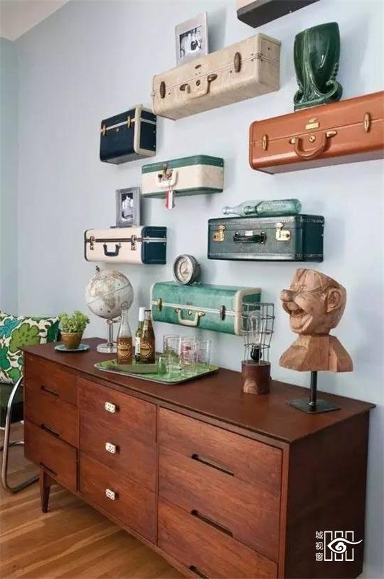 把行李箱里面做好隔层,挂于墙上,一个立式储物柜就诞生了,实用而特别。
