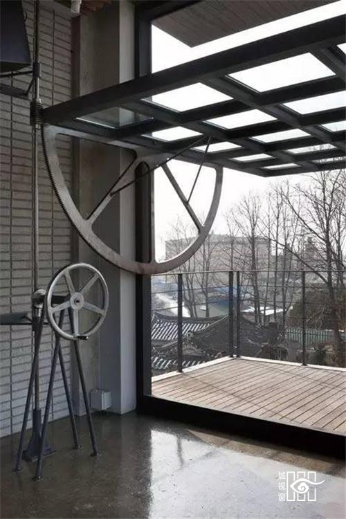 ▲一个玻璃钢架的大门,大大的转轴滚轮很有视觉冲击力。