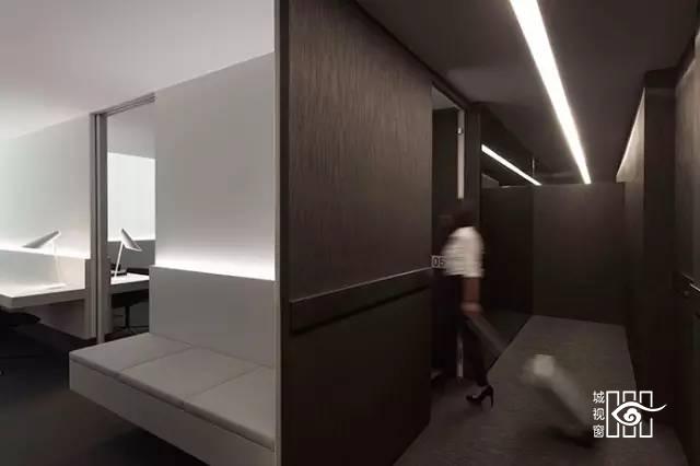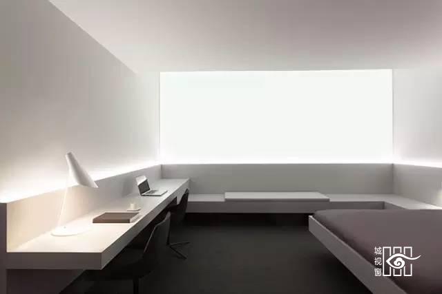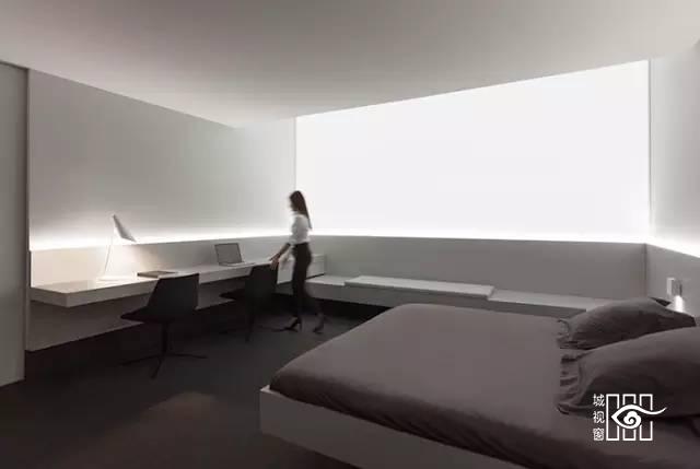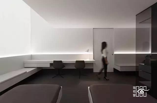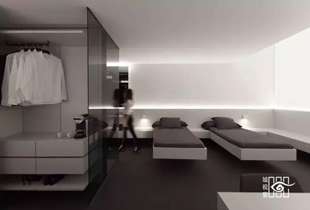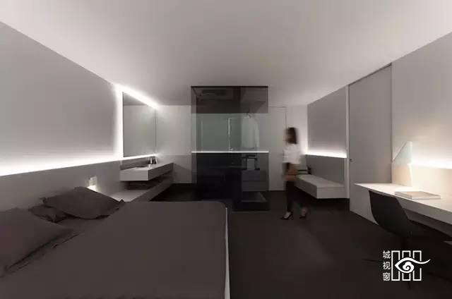 构成一个酒店的客房空间,用饰面家具和所有元素,以达到一致的氛围,设计忽略了地板和墙壁的存在,一个黑色的玻璃立方体置于房间中心,通过照明和家具允许不同空间之间的连续性。