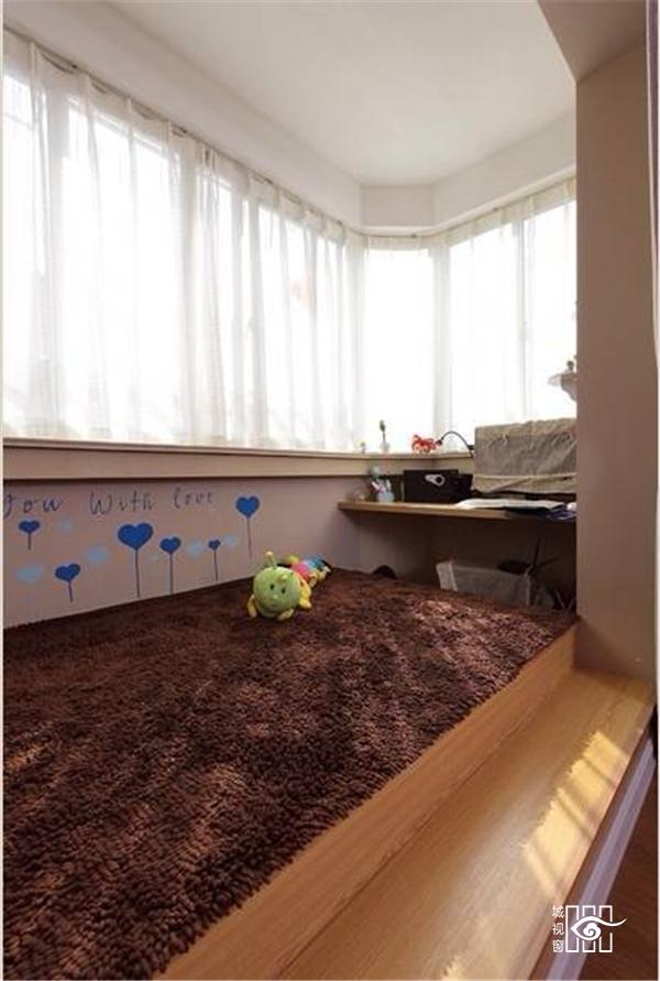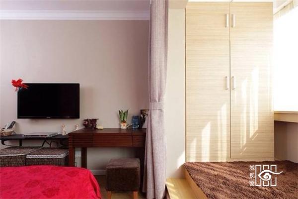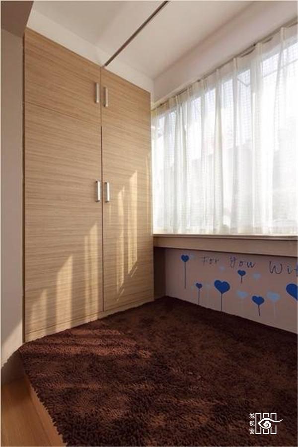 房间的小阳台被做成了地台,地台上做了一个柜子,可以放衣物