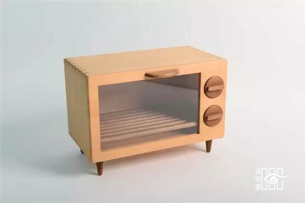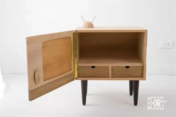 微波炉、电冰箱、电视机,其实都是用小学生课桌椅的回收木料,制作的“不插电家庭”储物柜