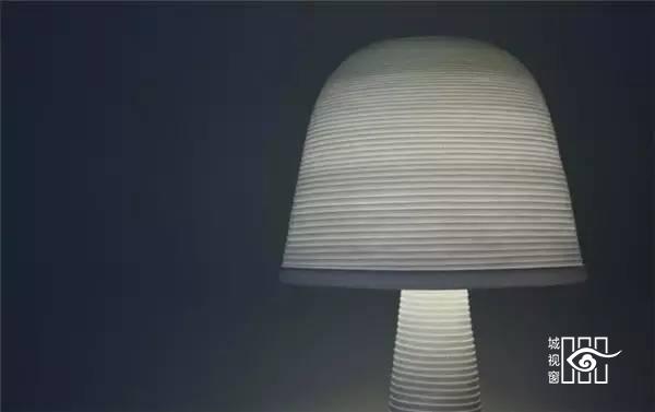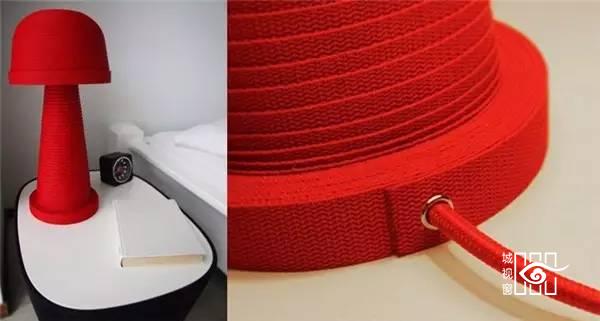 这是一款用尼龙织带盘起来的灯,粘结材料是胶水。不常规的构筑方式使灯轮廓反映出类似树木波折的生长过程的印痕,这些面料形成了一个神秘而独特的光效。