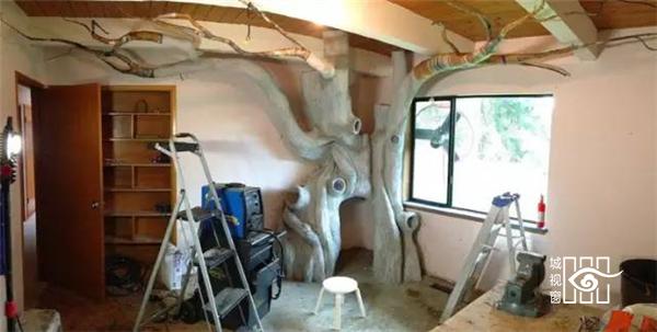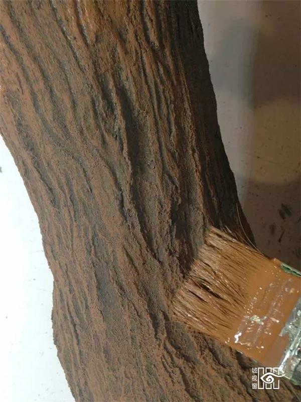 开始做外面的“树皮”,老爸用的一种混合物,从网上找的配方,2份的水泥,1份的水和1份的“聚合物液 - polymer fluid,还加了一些玻璃纤维进去,然后就糊到铁丝外皮上可以使做造型……