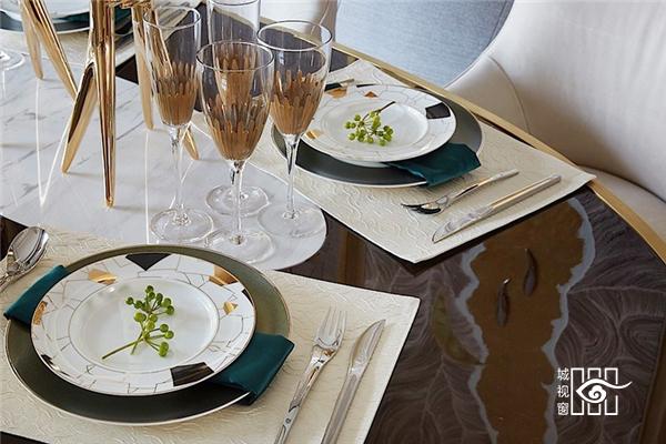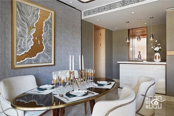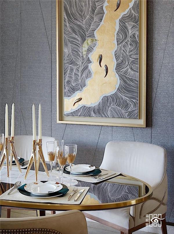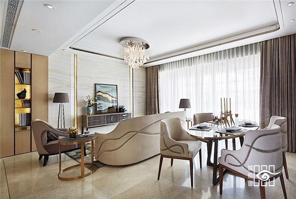黄浦·滨江位于浦江畔 ,江景是第一资源,客餐厅相连,做到限制下最大的落地窗视野吸引江景;值得一提的是,室内工艺上阳角采用流线型设计,客厅主背选取如海水微波的纹路似层叠海浪,又似水般具有剔透感,用立体工业几何化美学手法呈现,餐厅以及顶灯也用羽毛型抽象化,包括高端定制的沙发也是同样海与翼的曲线,灯光折射灵动剔透。