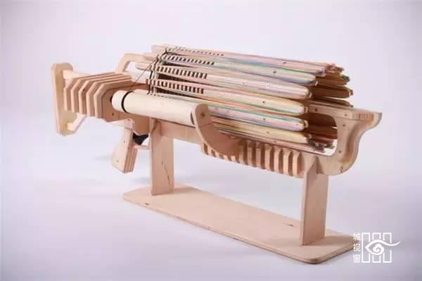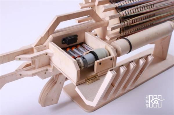 木制橡皮筋机枪(Rubber Band Machine Gun)是由Alex Shpetniy带来的一款有趣玩物。使用高品质的桦木胶合板制作,并且加入了电池供电的自动化设计,这挺橡皮筋机枪最长发射距离可达八米 ,并且每秒可发射十四根橡皮筋 ,因此不到一分钟时间即可将全载672发橡皮筋统统发射出去。倘若连装载橡皮筋也是自动的,那就堪称完美了。