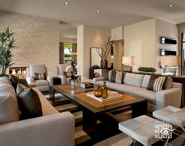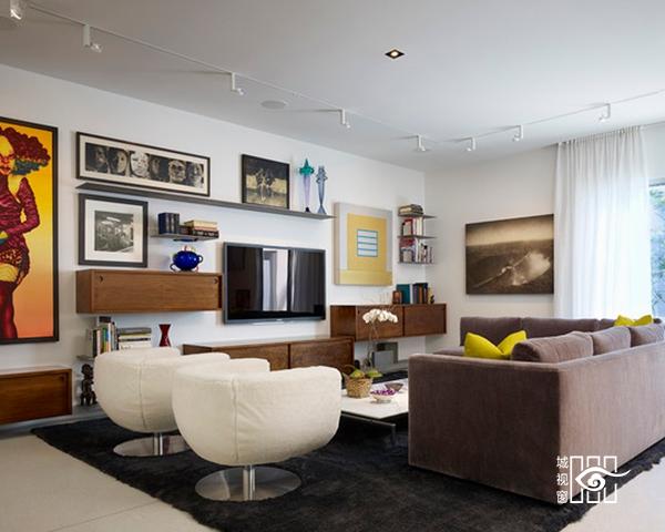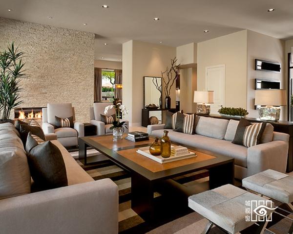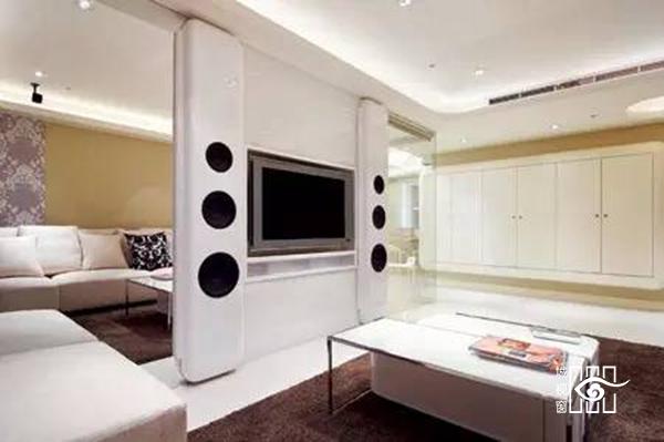 视听空间是客厅视觉注目的焦点,现代住宅愈来愈重视视听区域的设计。通常,视听区布置在主坐的迎立面或迎立面的斜角范围内,以便视听区域构成客厅空间的主要目视中心,并烘托出宾主和谐、融洽的气氛。