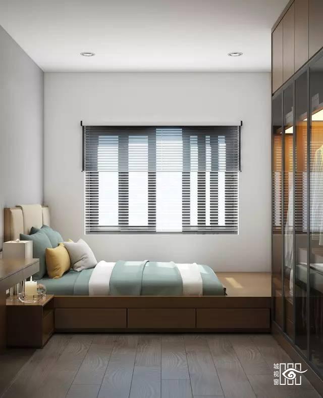 有时大面积的窗帘也可以拓展空间,就像设计师完成的这个卧室,也许这个空间扩大空间的神器就是“镜面。