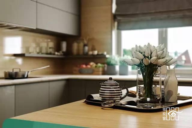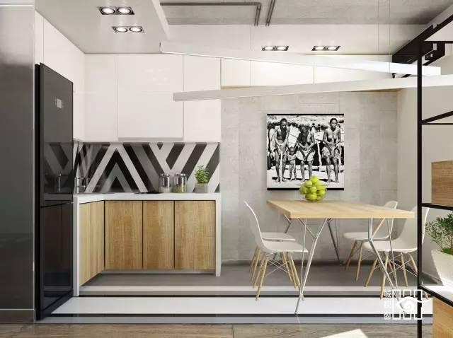 虽然小空间通常建议保持相同的地板以保持空间的连续性,但厨房的直线条拉长了空间。