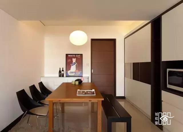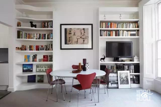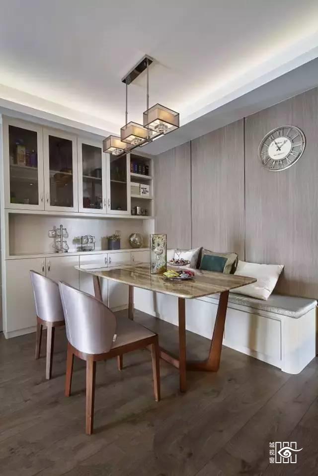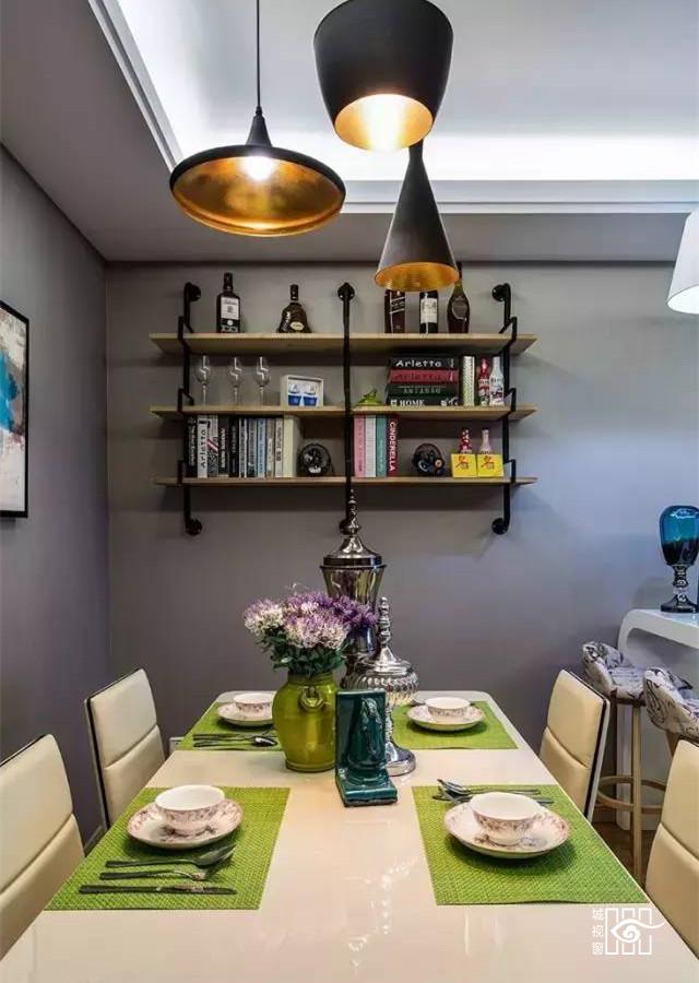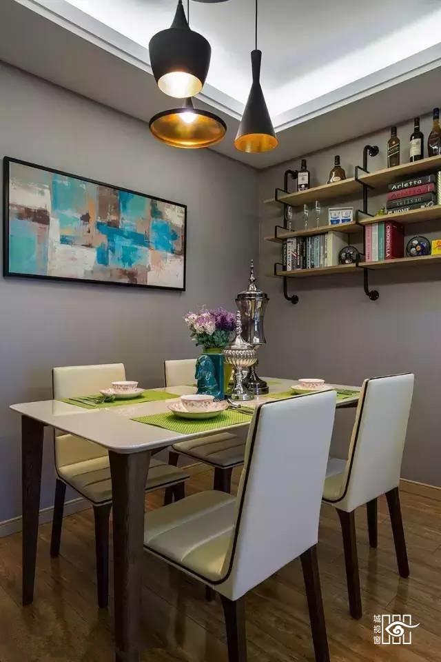 想要就餐区域整洁干净就要留足一定的收纳空间,让餐厅杂物能够得到合理的摆放。这款几字型的餐厅背景墙巧妙的把收纳的功能涵盖其中,餐酒、书本和一些小的瓶瓶罐罐都可以摆放上去,既节省了空间,也增加了美观度。