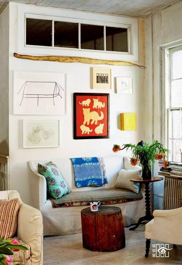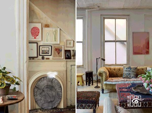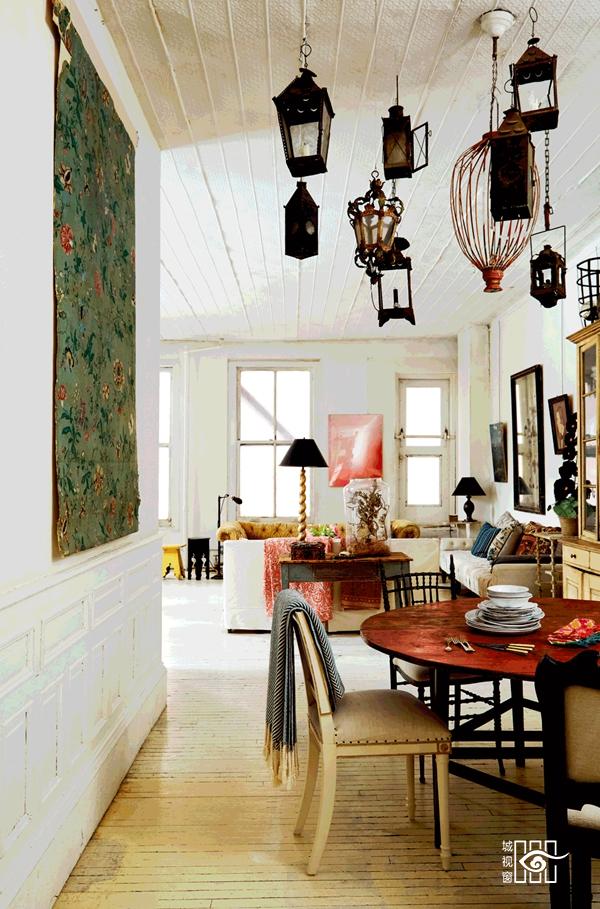 这座正门体现1850年代风格的公寓宛若一间乡下庭院。 餐厅的天花板上挂满各式灯笼, 墙上贴有一张古香古色的油画。 迷恋纸上作画的John新近推出了他的第一幅油画作品:《海洋植物》。
