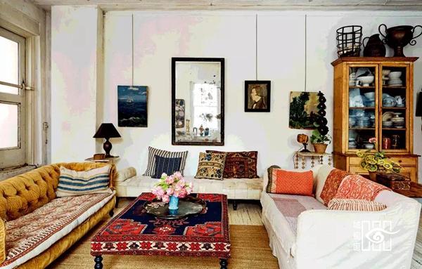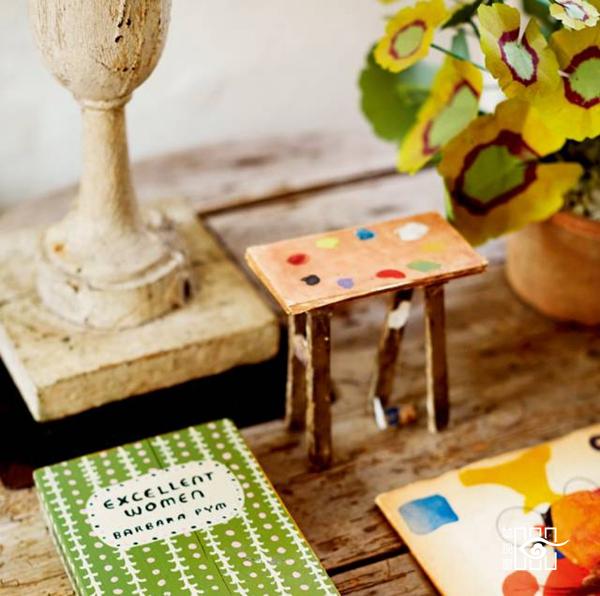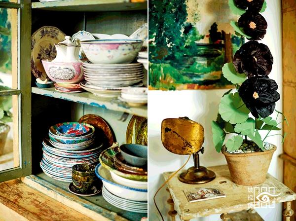 布艺为客厅注入了鲜明的色彩。纸花和由John染出云纹彩色或勾勒图案的餐具,是John自己的商店中最畅销的作品。