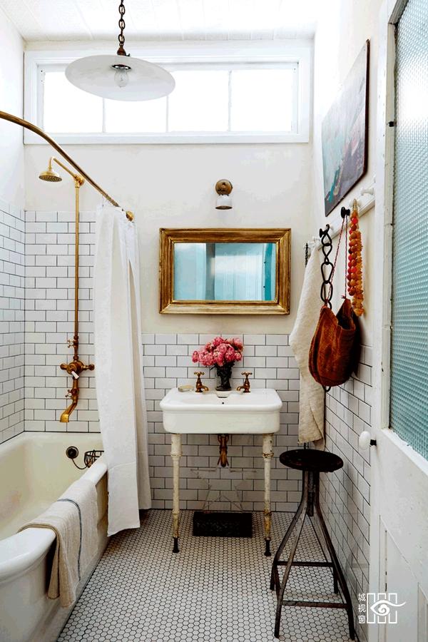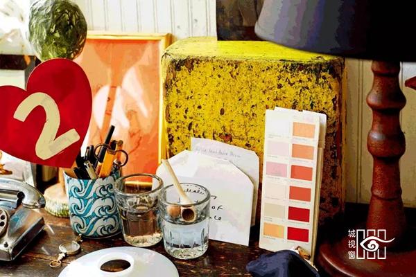 一款1920年代的浴缸、 复古凳子、老式浴巾,让浴室依旧神采焕发。工作台细节:色调活泼的设计样品和纪念物的巧妙组合,激发他的创作灵感。