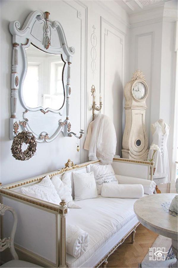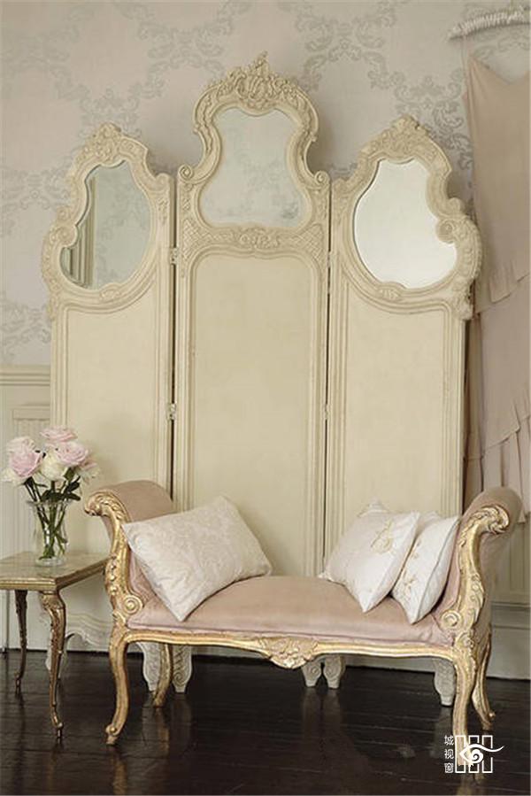 为了模仿自然形态,室内装饰部件也往往做成不对称形状,变化万千,但有时流于矫揉造作。室内墙面粉刷,爱用嫩绿、粉红、玫瑰红等鲜艳的浅色调,线脚大多用金色。室内护壁板有时用木板,有时作成精致的框格,框内四周有一圈花边,中间常衬以浅色东方织锦。