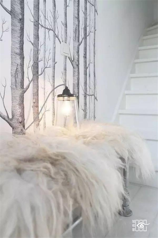 总得来说呢,这是非常勇敢的一个流派。毕竟在墙上贴一张大照片很容易让人误以为你在家开影楼了。但是,如果选得好的话,效果则非常惊艳。像上面这张图里就很机智地选择了一张模糊感的图片,同时也有足够的留白,不至于喧宾夺主。