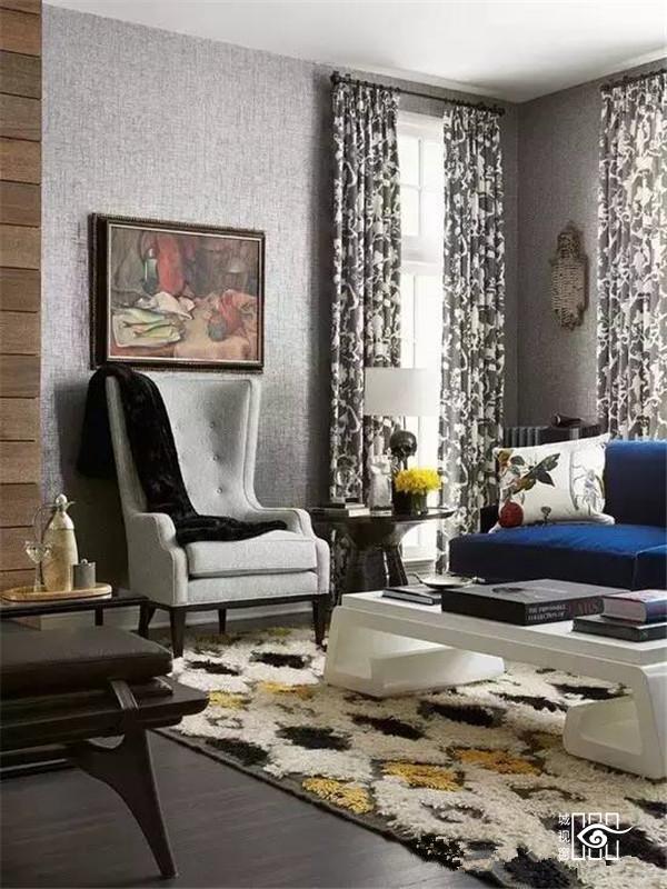 少数情况下,窗帘也可以随着地毯颜色走,但最好地毯本身也是中性色。如果地毯是中性色以外的颜色,就让窗帘稍微带上点地毯同色做点缀就可以了。