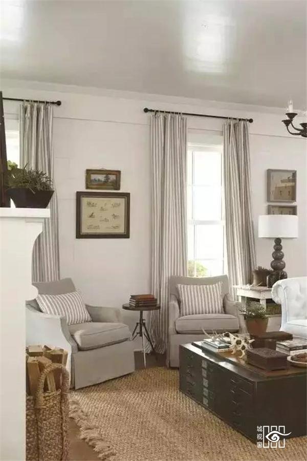 △比如这张图里茶几和地毯颜色都不适合作为窗帘颜色的参照,和灰白条纹的沙发靠垫保持一致就毫不违和,也符合了上述方案a里的“比墙壁颜色深一点点”准则。