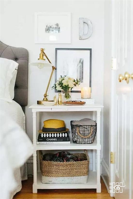 床头柜不仅仅是封闭的柜子,也可以是敞开的隔间,方便收纳杂物