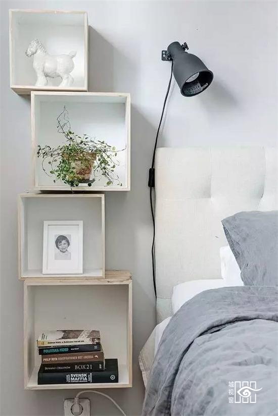DIY层层摞起的小箱子当床头柜不仅具备收纳功能,也便于拆卸清理。