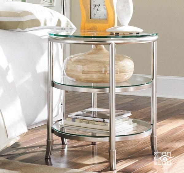 铝制柱形床头柜简洁干净大气,搭配相同大小玻璃镜面,尽显时尚美观。