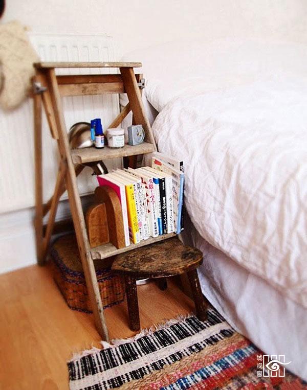 花园里落下的小凳子有用武之地了,放在床边充当床头柜很合适。