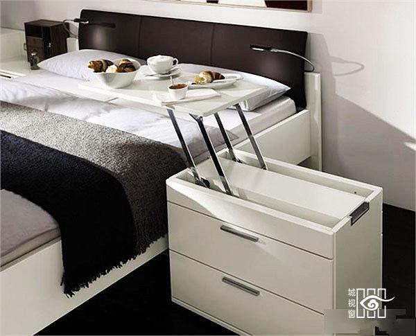看起来好像并不起眼的床头柜,原来藏着小秘密,这样慵懒的主人可以躺在床上吃饭了。