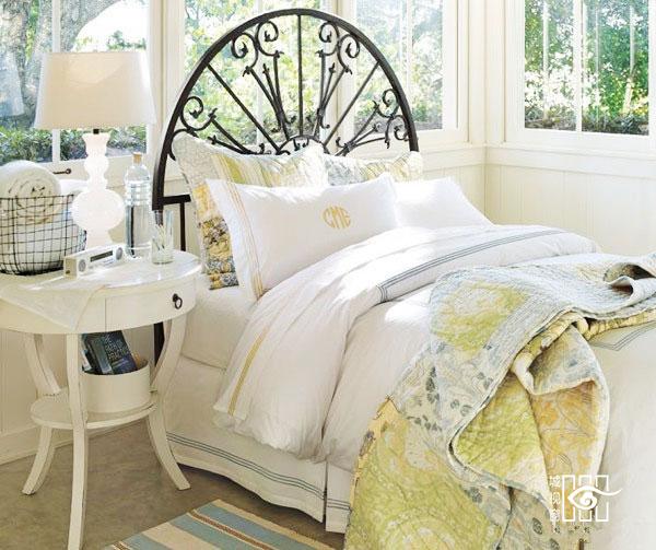 白色圆形床头柜搭配铁艺床,卧室空间田园得很精致。