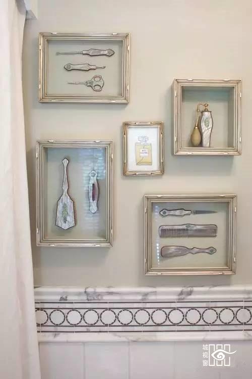 ↑好不容易淘到的复古卫浴用品,装在相框里,既能保护珍稀物件,又能装饰空间。