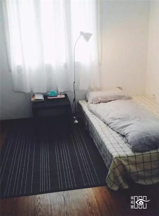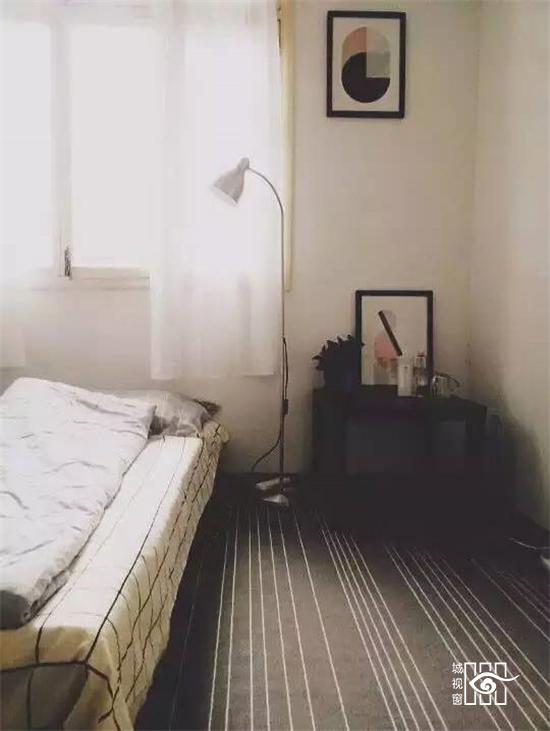 个人比较喜欢北欧的室内风格,所以挑的家具用品也是偏简洁的,整个房间的色调以黑白灰为主。房间很空,除了床和小桌子外没有其他家具,于是后来添设了一张桌子,也是黑色的。