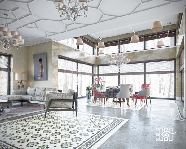 餐厅吊顶通往室外,吸收了自然光,延伸餐厅的纵深感,特色的设计让人不觉眼前一亮。
