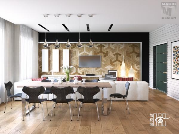 扇形的墙体包裹着餐桌椅,让餐厅呈现半开放式的状态,质感的立体墙体搭配简约的木质餐桌椅,让餐厅充满优雅舒适的迷人情调。
