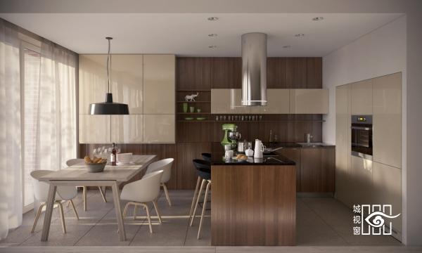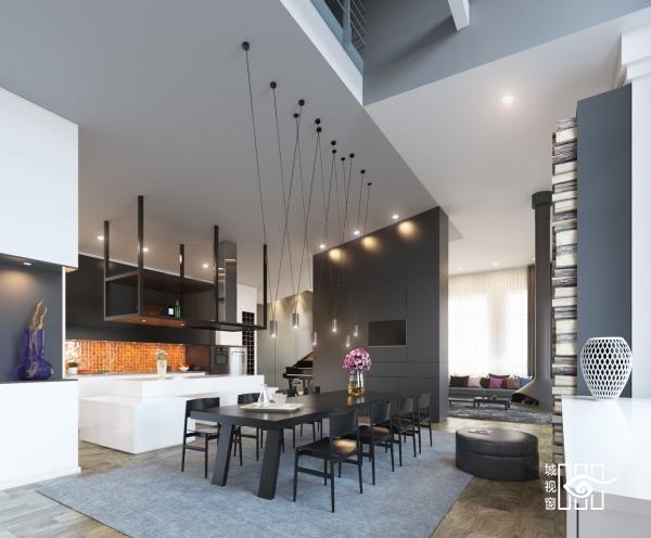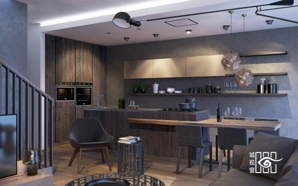 以如此紧凑的方式和黑暗的色调堆砌出来的厨房,黑色餐桌几乎像一个镜子,厨房高架给这个现代餐厅套上后现代的感觉,谁会拒绝这样一个玻璃与木质交加的空间。