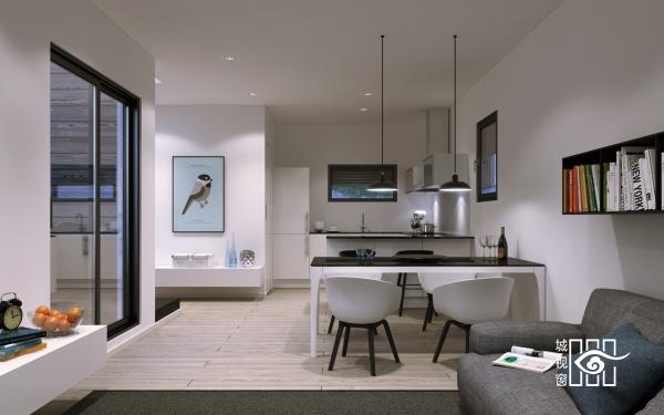 由世纪中期的流行风格引发的厨房设计灵感,带入了黑白餐桌和灰色软垫沙发。