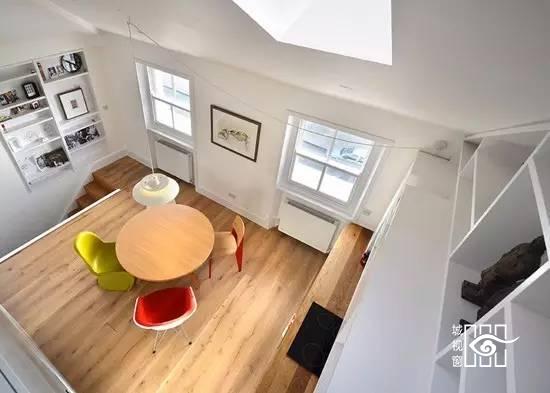 白色搁架自然地融入背景当中,创造了收纳空间也美化了楼梯墙。通往下层的楼梯采用内嵌于地板的设计,大大地节省了阁楼的空间。