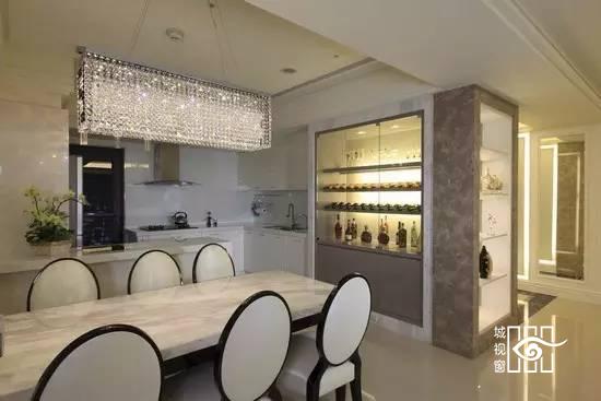 完整延展至餐厅的天花板,为了不至于显得繁复,改以嵌灯作为主要照明。岛吧旁设计藏有发光设备的酒柜,烘托酒瓶的高贵质感,并双向利用于走道,改为美丽端景。