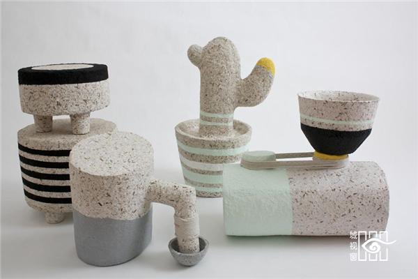 这个系列的家具是由加拿大 Dear Human 工作室研究设计,该系列家具是设计师尝试使用回收的废纸经过处理后设计,他们的材料来源是当地的工业废纸,这些废纸经过处理后,经过类似陶瓷的制作工艺,可以实现纸糊的紧密粘合,相当解释,搭配釉面陶瓷还会更加美观,制作为墙壁装饰还有隔音效果。