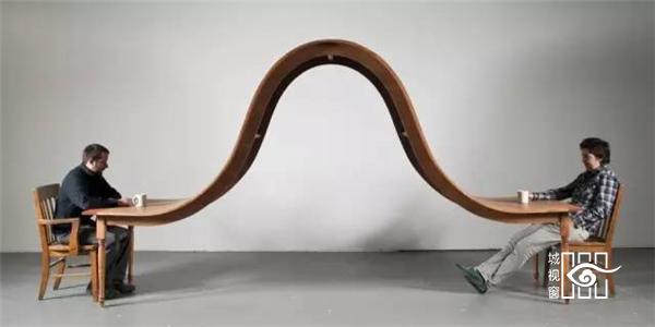 这件餐桌叫“回避对话”,来自设计师Michael Beitz的创意。桌子的表面在中部升高为拱,阻止了坐在两端人的视野。如此创意既充满趣味性,又具有哲学意味。