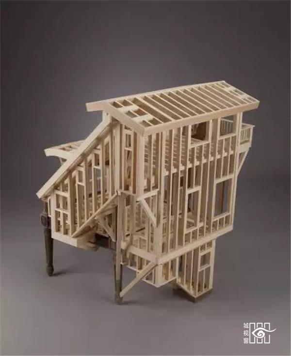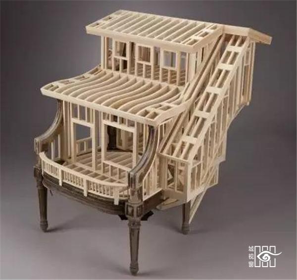 这件木椅子有着房屋的框架,来自雕塑家Ted Lott的创意,探索家具与建筑之间的关联。正如房子是为人们提供居住的空间,椅子也是在为人提供坐的空间。