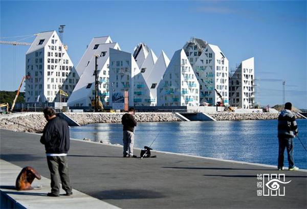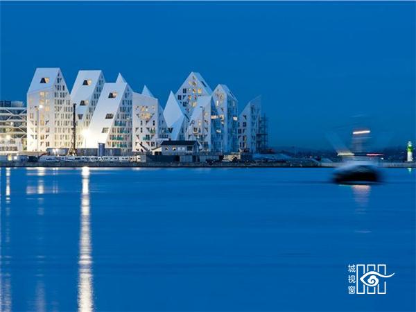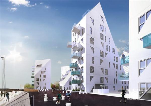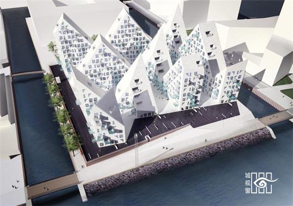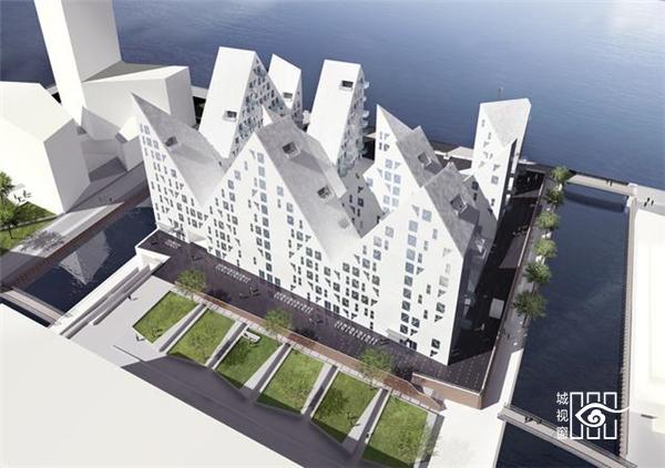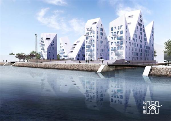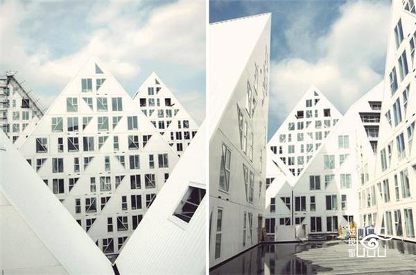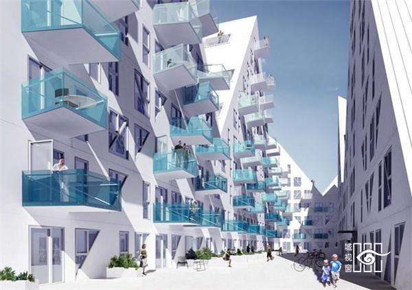 建筑的形式和名称都来自于冰山,最具特色的是那些安装了玻璃栏杆的出挑阳台,玻璃的颜色从蓝色到透明分为不同的层次,形成了闪烁的效果,像极了北极圈的景象。