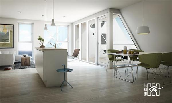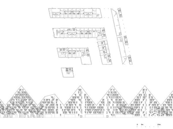 一层都设置那些两层的联排别墅,并将其整合在这多变的三角形建筑中。阁楼则都位于顶层,尤其是那些山峰和尖顶处。