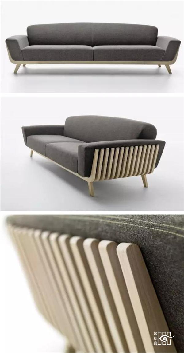 这个沙发设计,以简单的木结构组成,整体大方、简洁、干净,灰色的沙发套配合木质结构使人感觉十分和谐,沙发两侧使用的成排的条形木质结构,成功避免大部分沙发边缘的尖锐造型。沙发造型实用,使用安全、便利、简洁,是一款不错的沙发设计。
