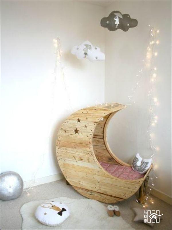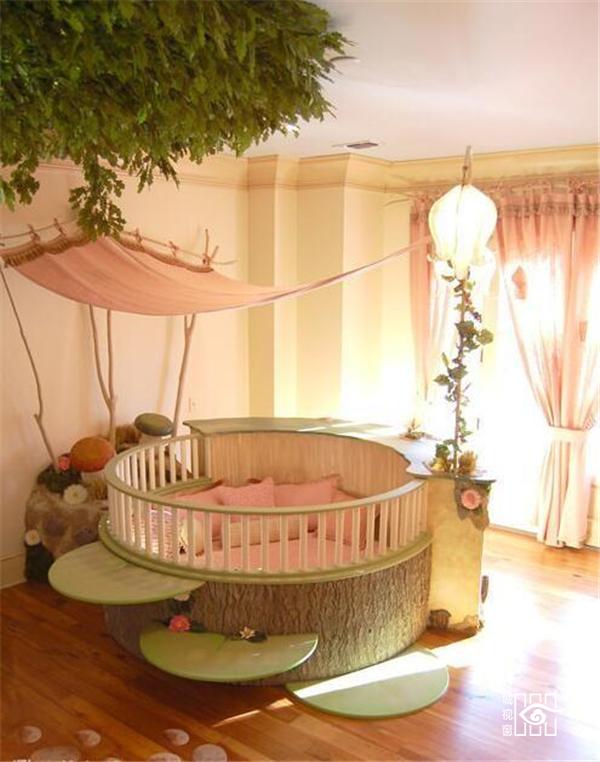 1、圆形的床,像粗壮的树墩,搭配绿色、粉色一点也不会觉得突兀,当然这是小baby的床,女生看了会母爱爆棚吧!