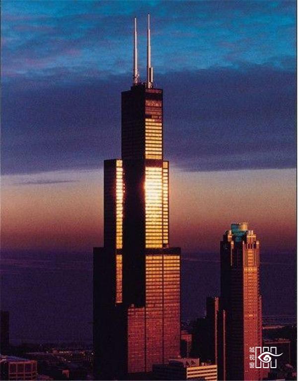 世界第九高楼:韦莱集团大厦,位于美国伊利诺州芝加哥市由SOM建筑设计事务所建筑师布鲁斯·格雷厄姆和结构工程师法兹勒汗设计,造价39亿美元,建筑层数110层,总高度443米。