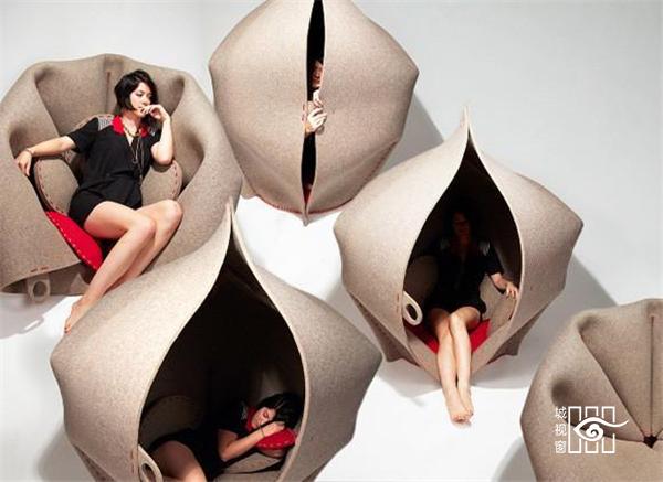 这款可开放可隐蔽的沙发,平时就像正常的沙发椅子一样,当我们想一个人呆的时候可以将这个沙发封闭起来,进入一个人的世界。沙发采用可降解的环保绿色材料手工剪裁缝合而成,色彩配色时尚鲜艳。