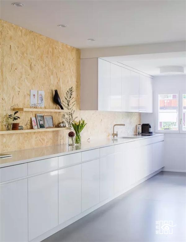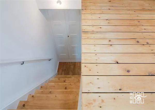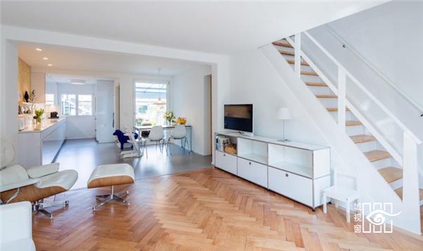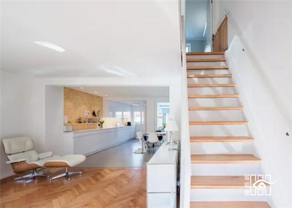 Rafael Schmid 的第一件事是将后来的装修清理掉,露出原有的材料,墙面再刷白了一次,基本上没有增加任何装饰,配合着传统人字形的木地板,看起来清爽很多。整体住宅都是原木色和纯白色的搭配,比如白色的扶手搭配浅棕色的楼梯面,白色的橱柜、餐桌搭配一个木纹墙,在干净简洁的纯白色中流露出一抹温暖的颜色,符合家庭的气氛。