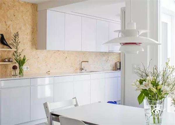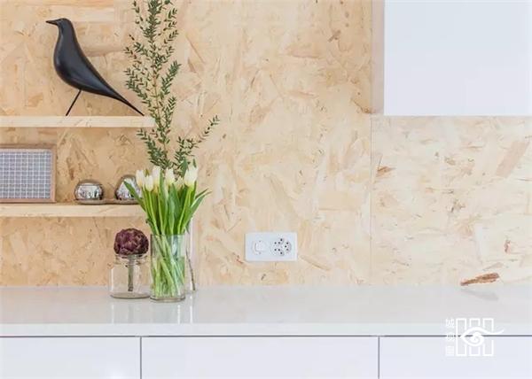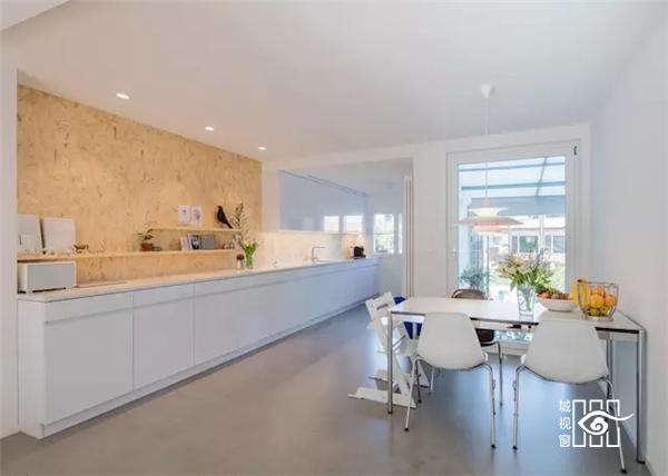 餐厅的天花板上有三盏射灯对着木纹墙,使得色调看起来更加温暖,厨房和餐厅的区别就可以体现出来了。放上一些绿植等装饰后,形成一个有情调的小角落。简单却巧妙。